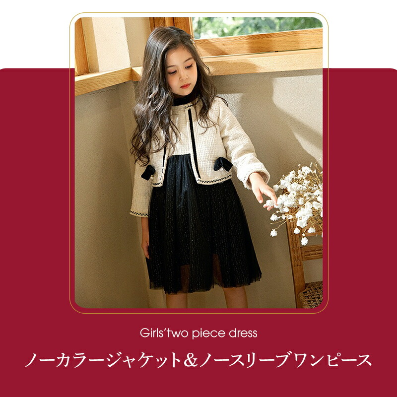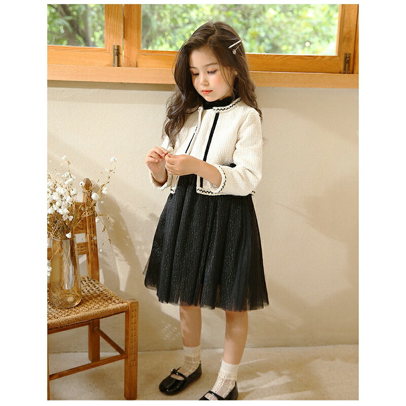 ワンピース&ジャケット お姫様のアンサンブルスーツセット チュールドレススカート 上品 かわいい おしゃれ ガールズ フォーマルワンピース キッズフォーマル 入学 式 白 黒