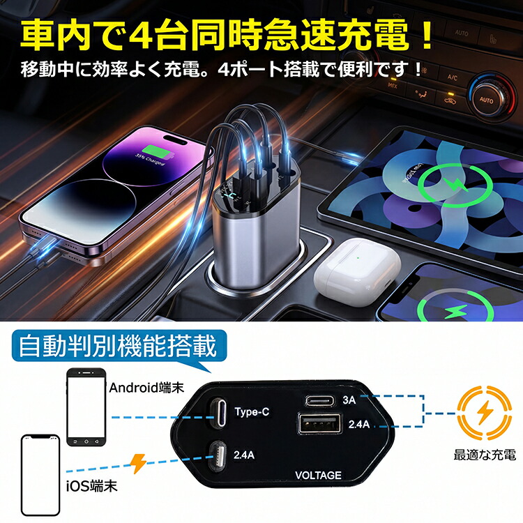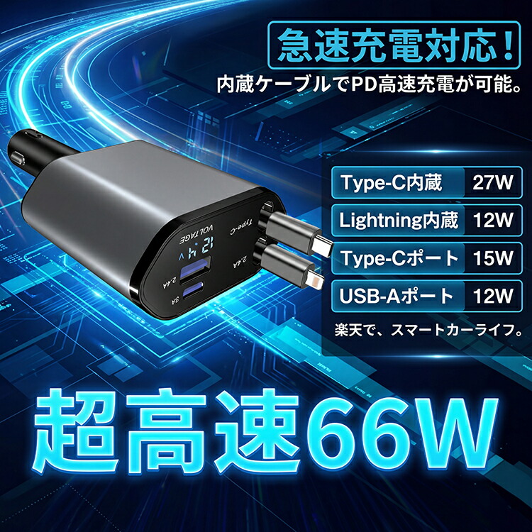 シガーソケット 充電器 巻き取り リール式 車 USB Type-C/Lightning 20W PD 急速充電 車載充電 4ポート カーチャージャー 4台同時に充電 電圧測定 12V車 24V車 シガーチャージャー USBポート付 リールタイプ 後部座席 iPhone Android スマホ iPhone iphone 充電 車 おすすめ ケーブル 小型 ポート 増設 typeC 4in1 急速 カーグッズ 車用品 車載 コンセント カーアクセサリー 人気商品 人気 かっこいい カッコイイ オシャレ おしゃれ オススメ おすすめ 愛車 カスタマイズ 父の日 母の日 プレゼント 誕生日 彼氏 彼女 友達 父 母 シンプル バレンタイン クリスマス ホワイトデー 10代 20代 30代 40代 50代 60代 男性 カー用品 車内アクセサリー 簡単 取付 内装 カスタム