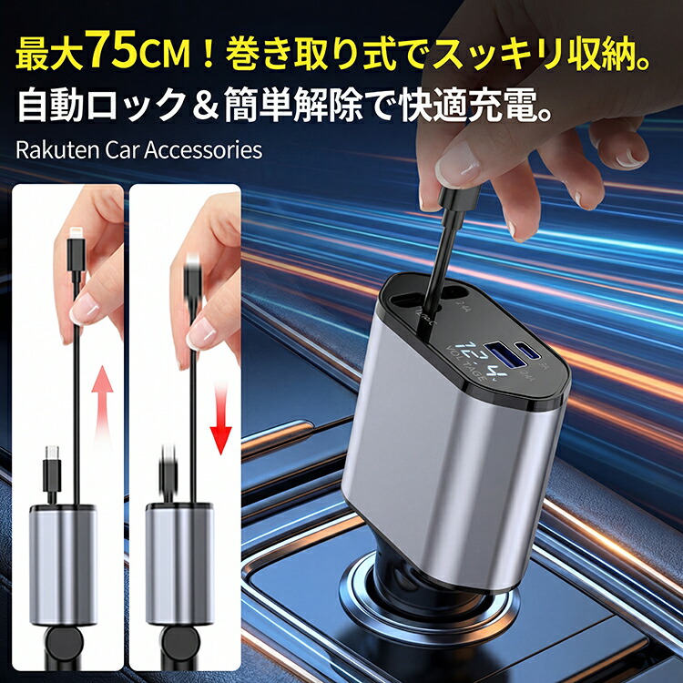 - 巻取り式ケーブルは約3cm~75cmまでスムーズに伸縮し、前席・後席どちらからでも使いやすく車内をすっきり保てます。