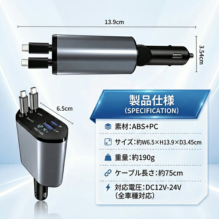 - 180度回転するシガーソケットヘッド採用で省スペースに設置でき、使用しない時は簡単に収納できる実用的なカーチャージャーです。