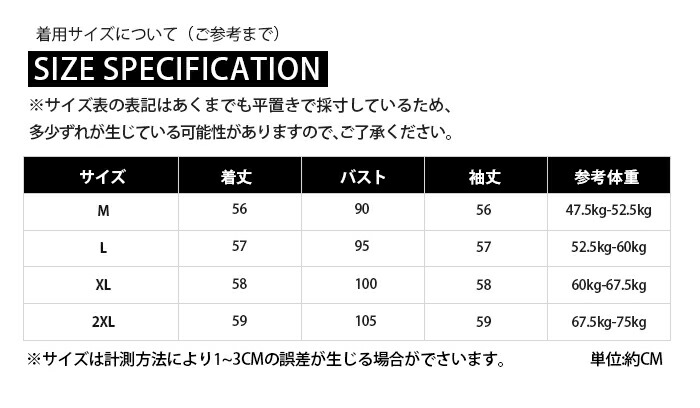 サイズ表では数枚を採寸して、その平均値を記載しておりますので、記載サイズは目安としてご参考ください。