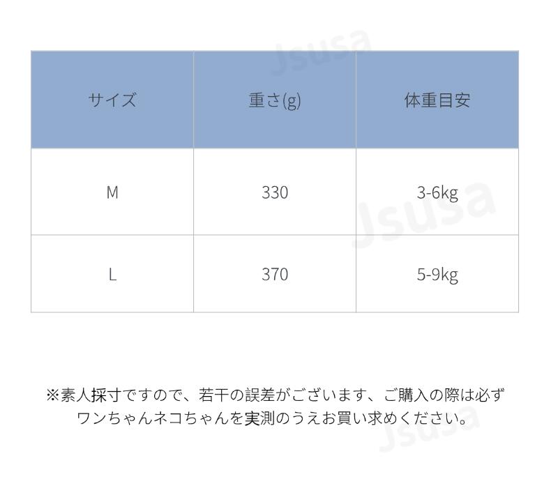 【M】長さ38cm 幅21cm 胸周り48cm 左右足の間隔6cm 前足~後足の間隔14cm 重さ330g 体重目安3-6kg