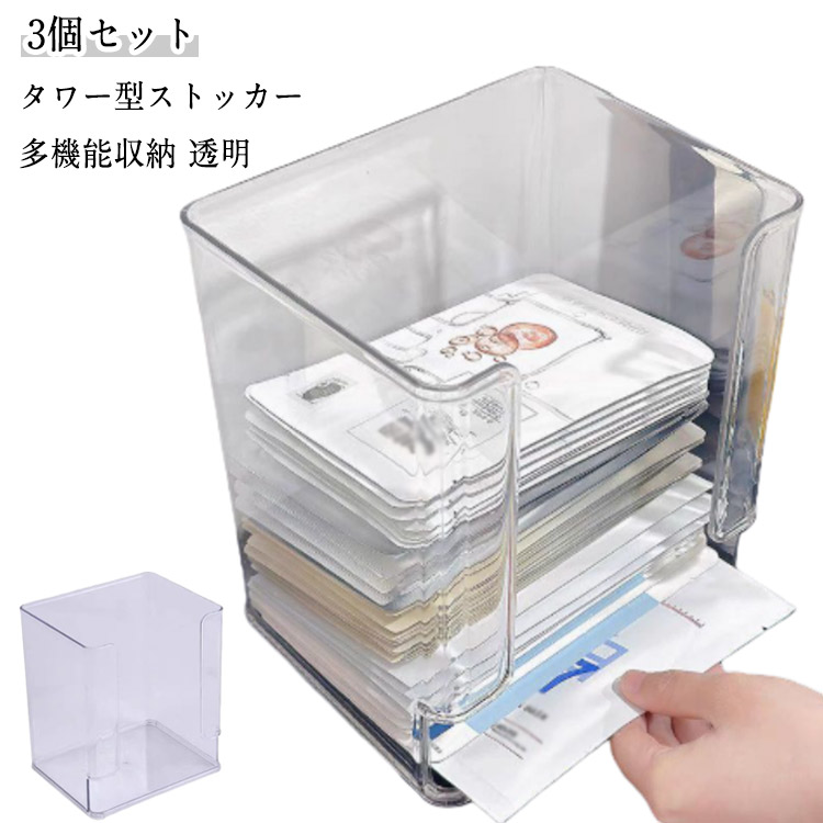 収納ボックス タワー型ストッカー 透明無蓋設計 3個セット デスクトップ化粧台卓上キッチン用 インスタントラーメンケース 上から入れて下から取り出し 小物整理