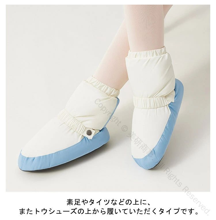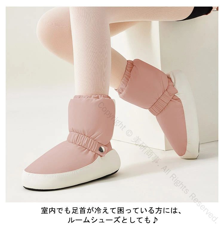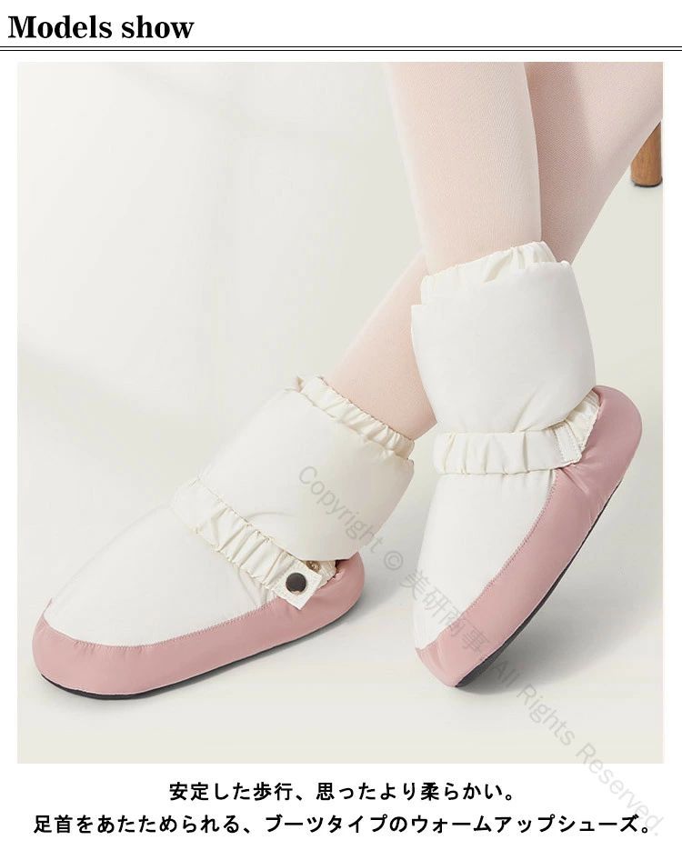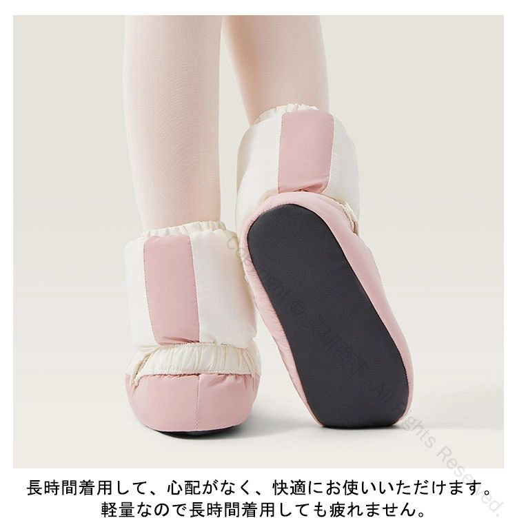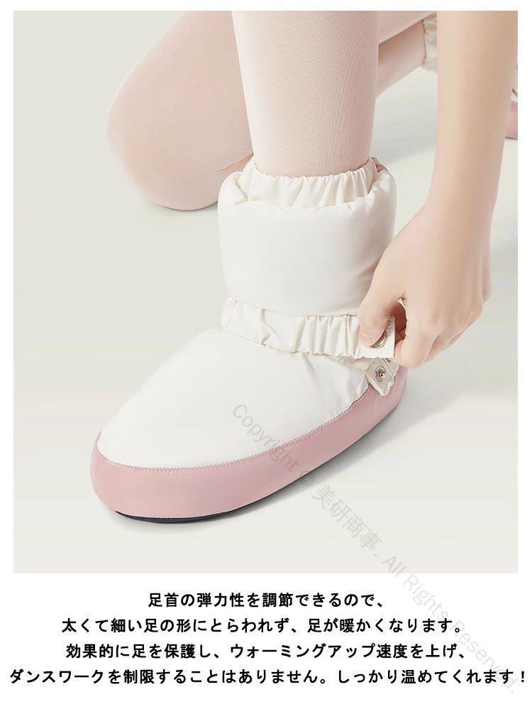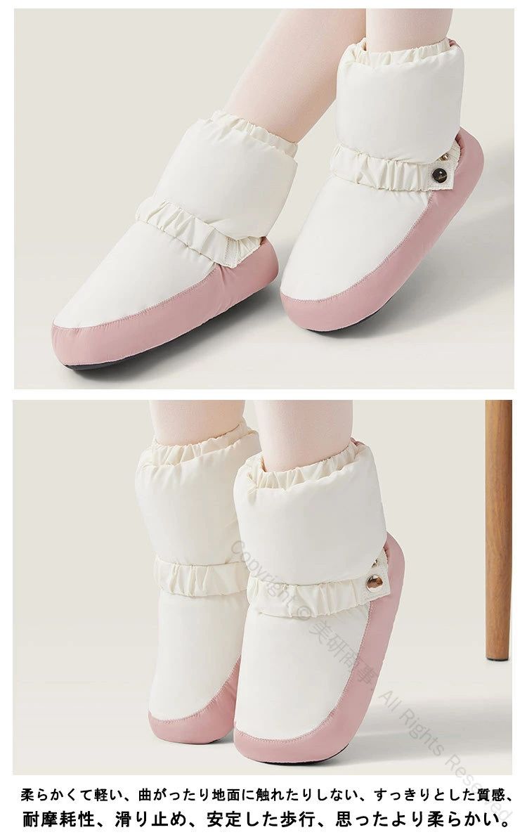 安定した歩行、思ったより柔らかい。足首をあたためられる、ブーツタイプのウォームアップシューズ。柔らかくて軽い、曲がったり地面に触れたりしない、すっきりとした質感、耐摩耗性、滑り止め、安定した歩行、思ったより柔らかい。素足やタイツなどの上に、またトウシューズの上から履いていただくタイプです。足首の弾力性を調節できるので、太くて細い足の形にとらわれず、足が暖かくなります。 効果的に足を保護し、ウォーミングアップ速度を上げ、ダンスワークを制限することはありません。しっかり温めてくれます!室内でも足首が冷えて困っている方には、ルームシューズとしても♪ふわふわでやわらかい素材を使用し、保温性・通気性に優れています。長時間着用して、心配がなく、快適にお使いいただけます。 軽量なので長時間着用しても疲れません。