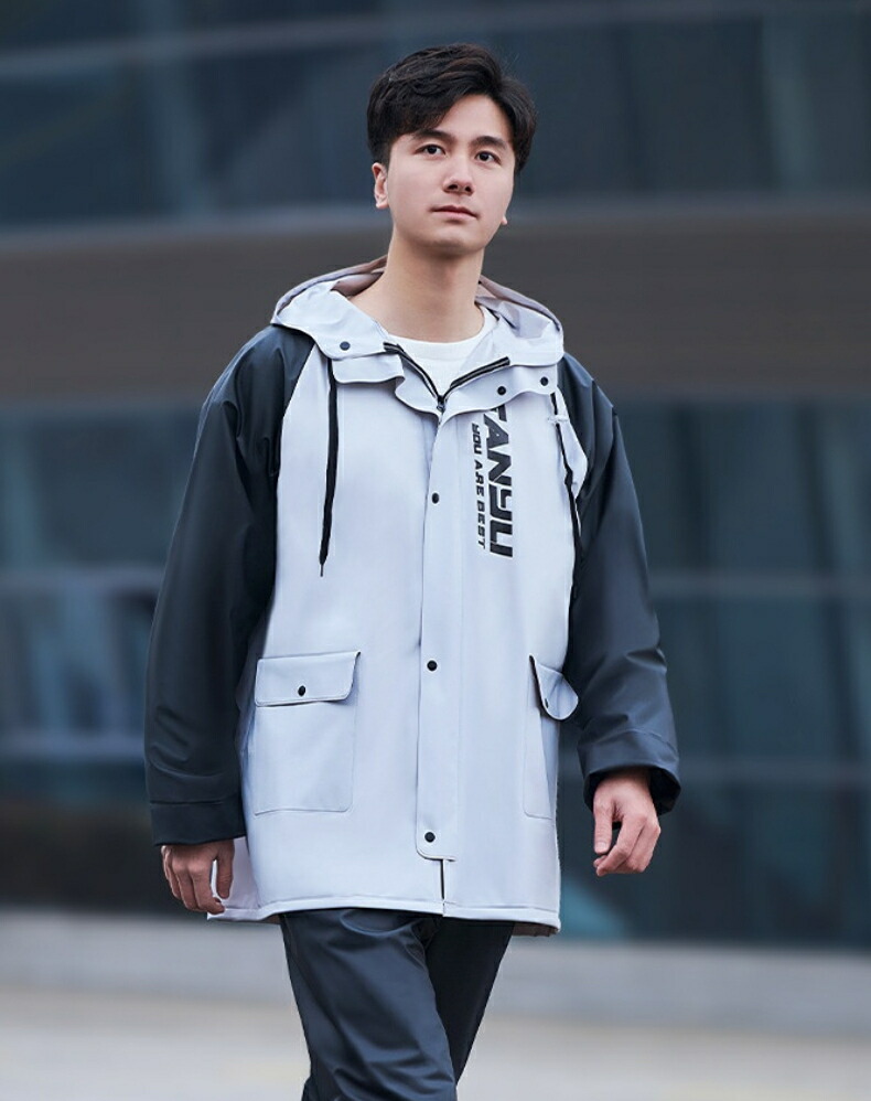帽子は調整ひもが付いていて、大雨の際にしっかり閉めると雨水の侵入を防げます。袖口にゴム紐なのでお手首とフィットします。