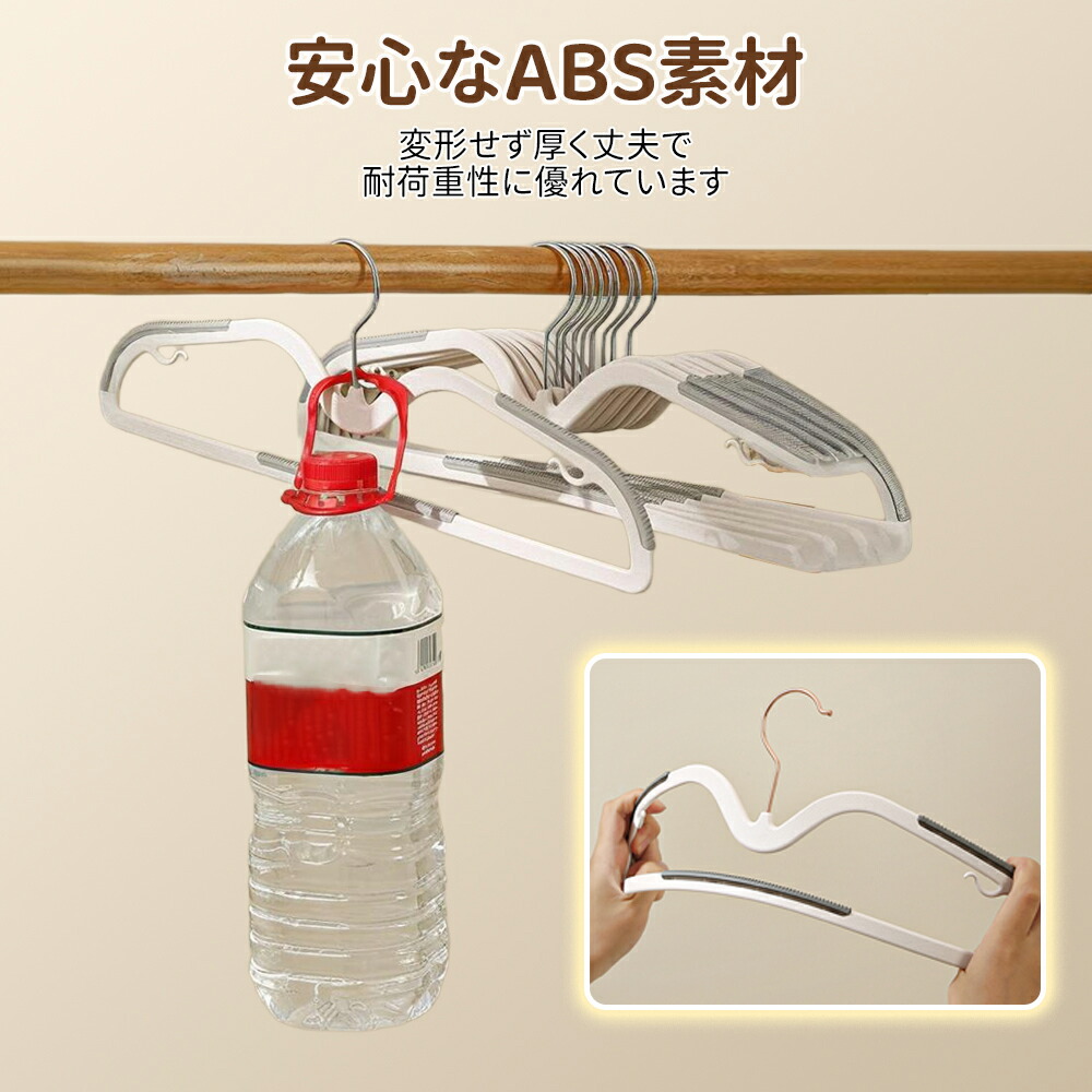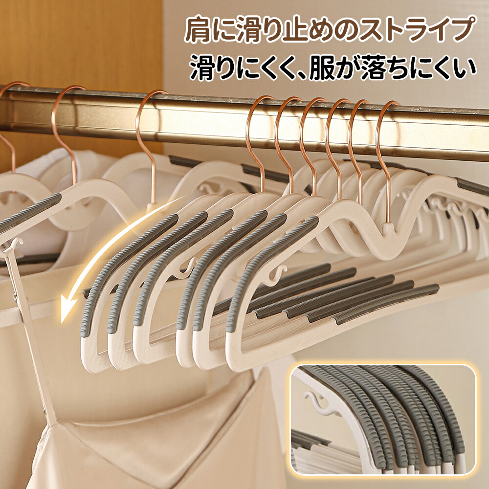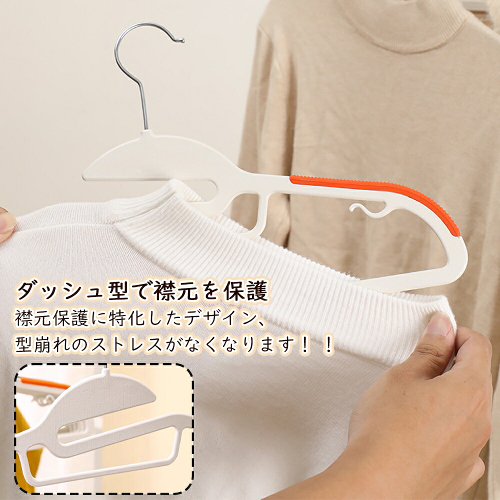 このハンガーは、細部まで行き届いた設計が魅力です。表面に施された特殊な加工により、高い滑り止め効果を発揮します。なめらかな素材の洋服やシルクのようになめらかな生地も、しっかりとキャッチしてくれるので、落下を防いでくれます。更に、ハンガーの肩の部分は人間工学に基づいて設計されており、洋服にハンガーの跡が付きにくいのも特徴です。肩部分が洋服に与える負担を最小限に抑えることで、大切な洋服を型崩れから守ります。