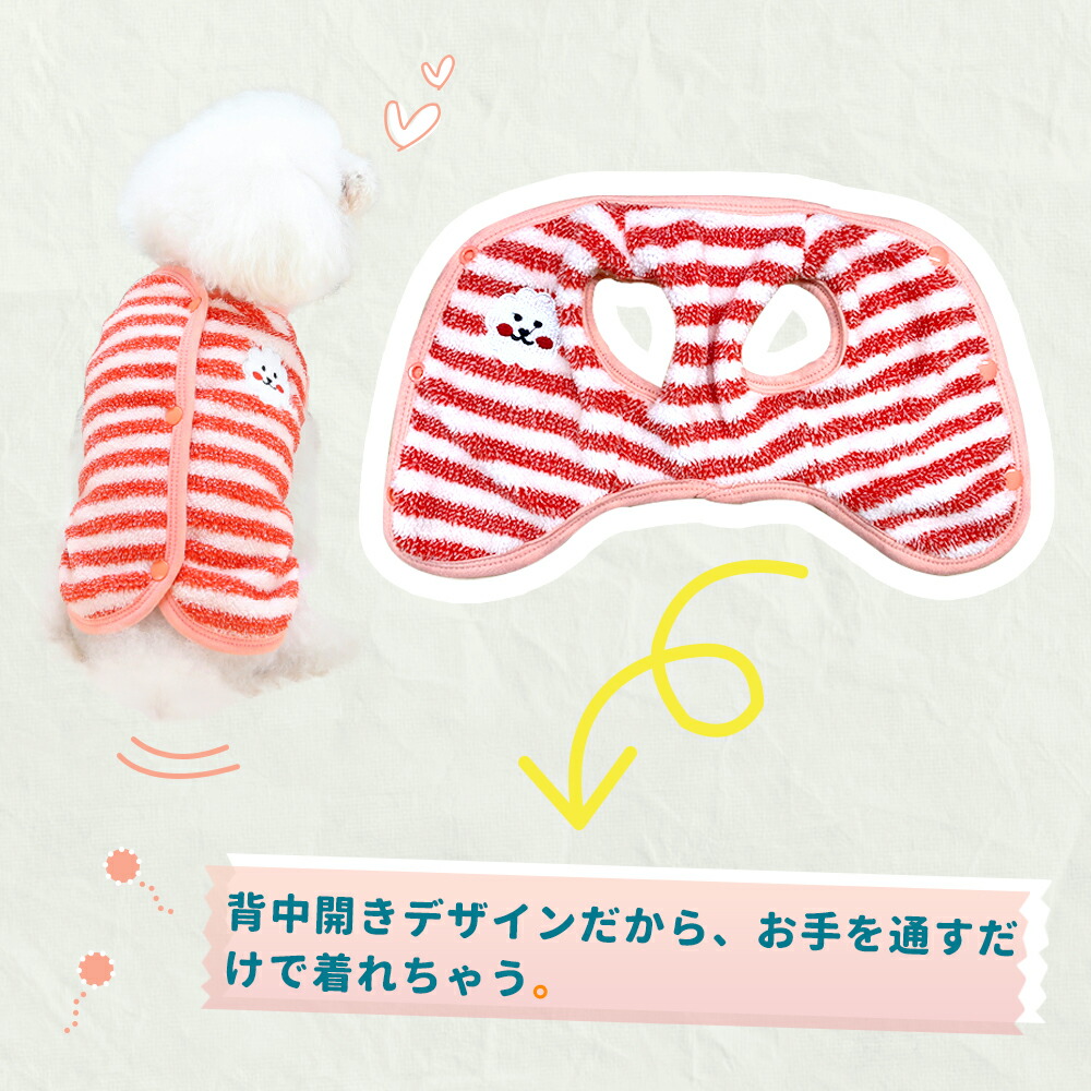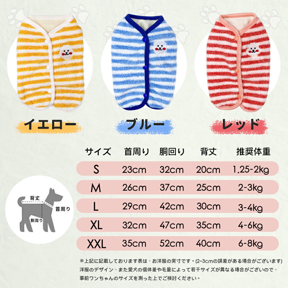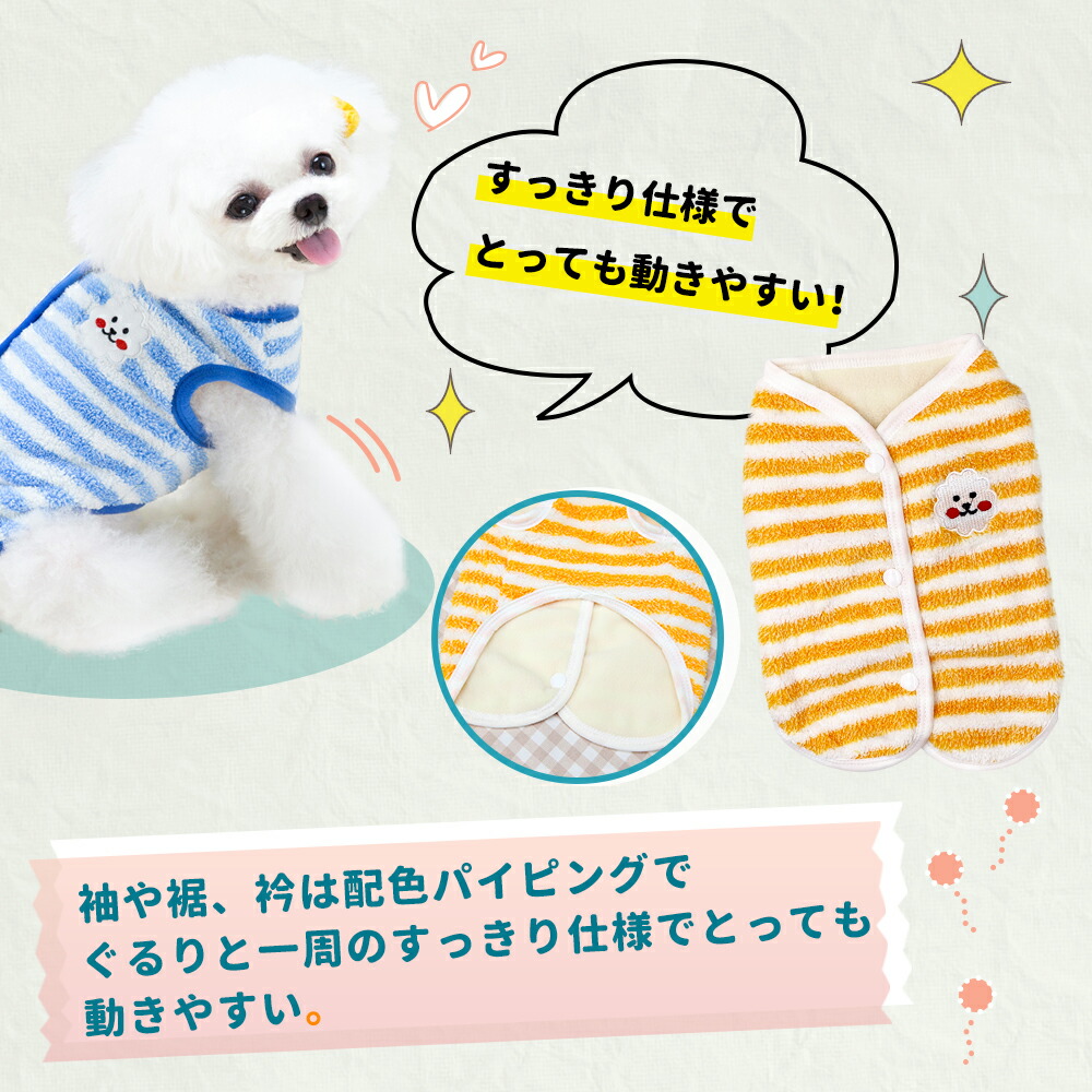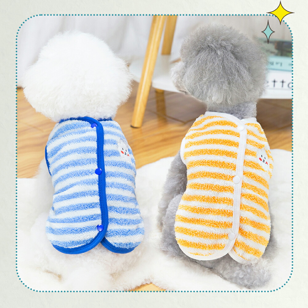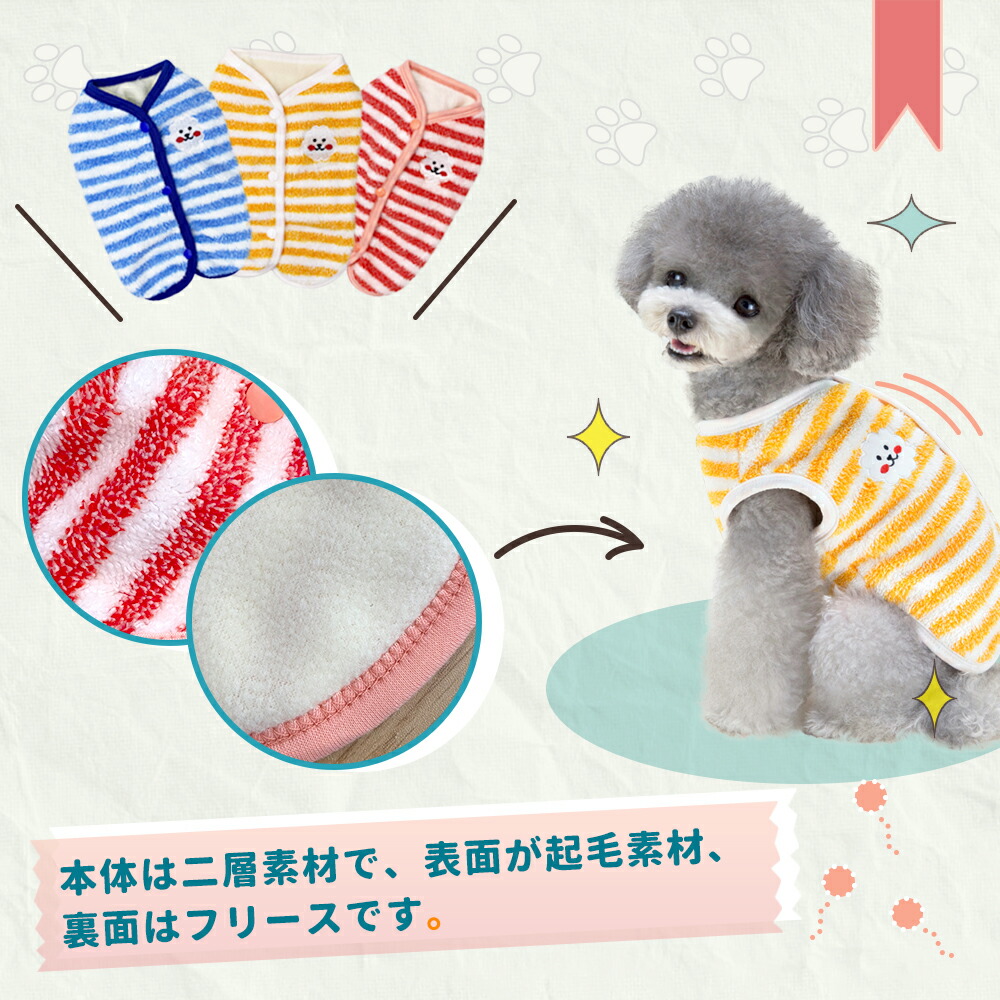 犬服 背中開き ベスト ストライプ柄 ドッグウェア 小型犬 服 もこもこ 裏起毛 防寒 冬服 袖なし暖かい ダウン前あき レッド イエロー ブルー 前ボタン