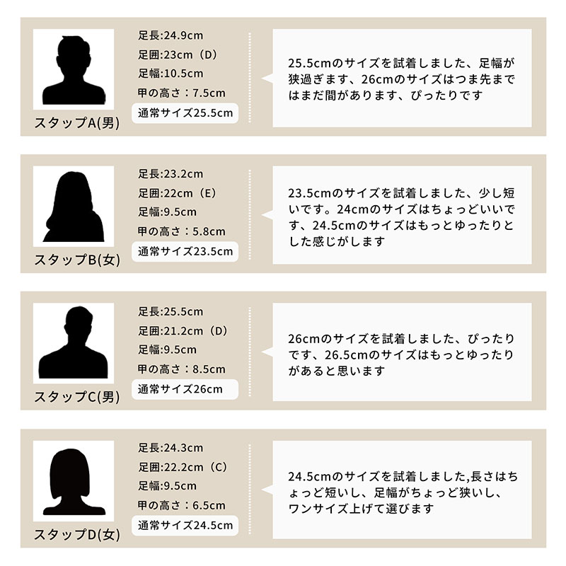 24.5cmのサイズを試着しました。長さはちよっど短いし、足幅がちょっど狭いし、ワンサイズ上けて選びます。