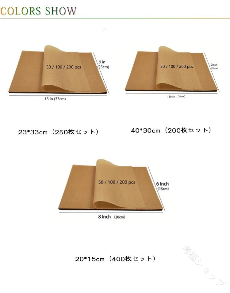 ・20*15cm(400枚セット)・40*30cm(200枚セット)・23*33cm(200枚セット)使いやすいサイズにカット済み※商品のサイズは手作業で測定させて頂いておりますので、若干の誤差があります。