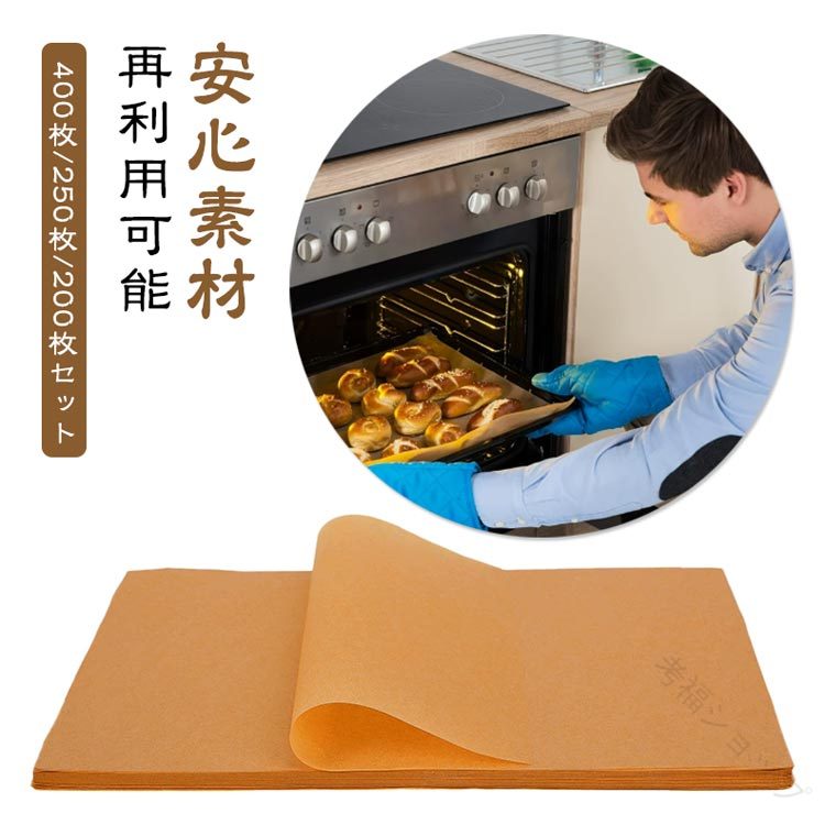 .400枚 250枚 200枚 セット の クッキングシート は 無漂白 無添加 で ナチュラル な 未晒 クラフト紙 を 使用 した 角型 の オーブンシート と ベーキングシート です。耐油 耐熱 性 が 高く、 剥離性 に 優れている ため、 オーブン ベーキング ケーキ作り 製パン 料理 グリル フライ 蒸し など さまざま な 調理 シーン に 最適 です。。