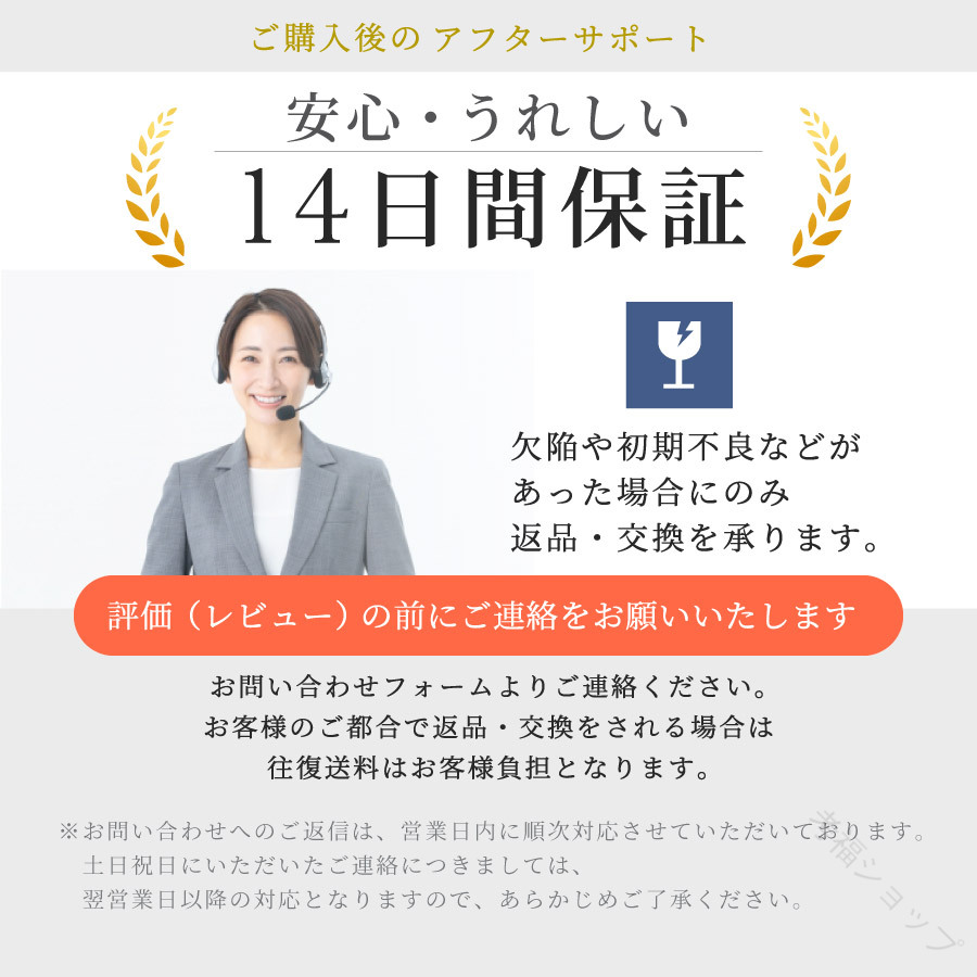 出荷前に全て検品を行っておりますが、万が一商品に不具合があった場合は、お問い合わせフォームまたはメールよりご連絡頂けます様お願い申し上げます。速やかに対応致しますのでご安心ください。