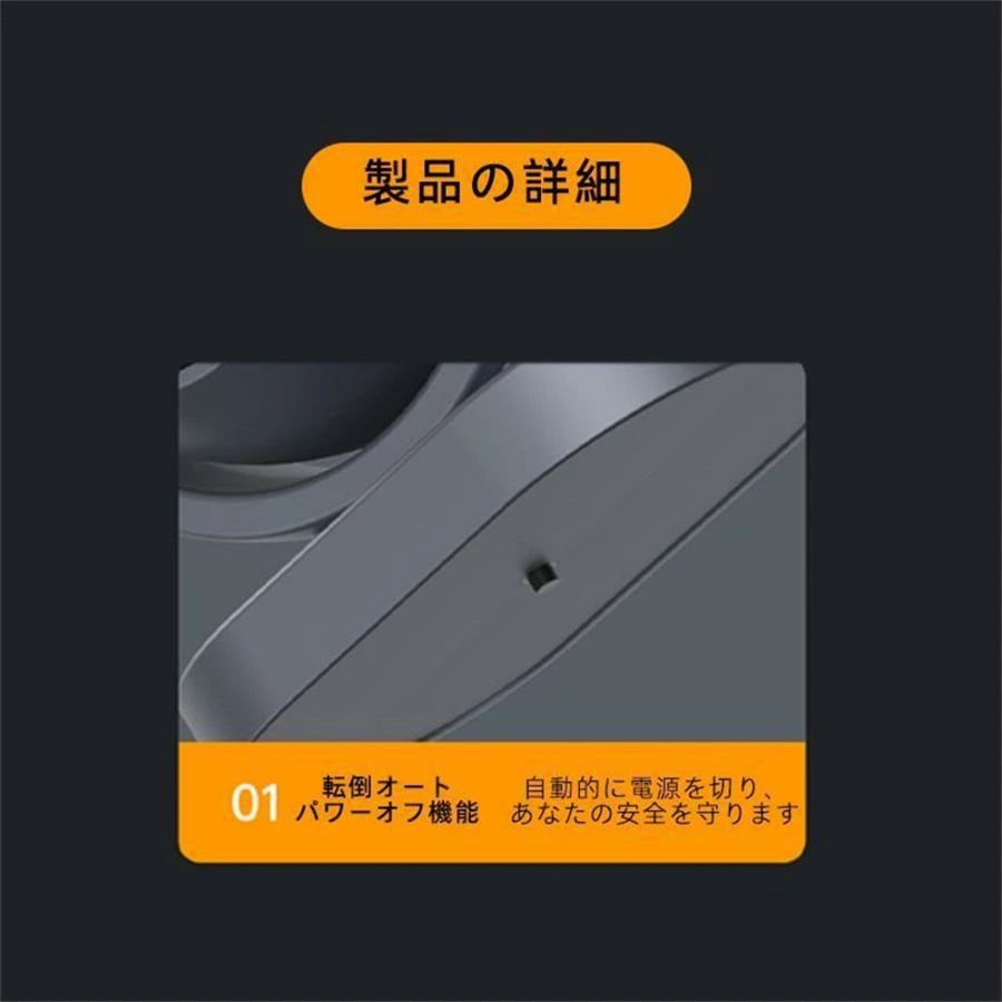安全機能:転倒自動オフや過熱保護などの安全機能が備わっています。誤って倒れたり、過熱したりすることによる事故を防ぎます。家族やペットが安全に利用できる設計です。