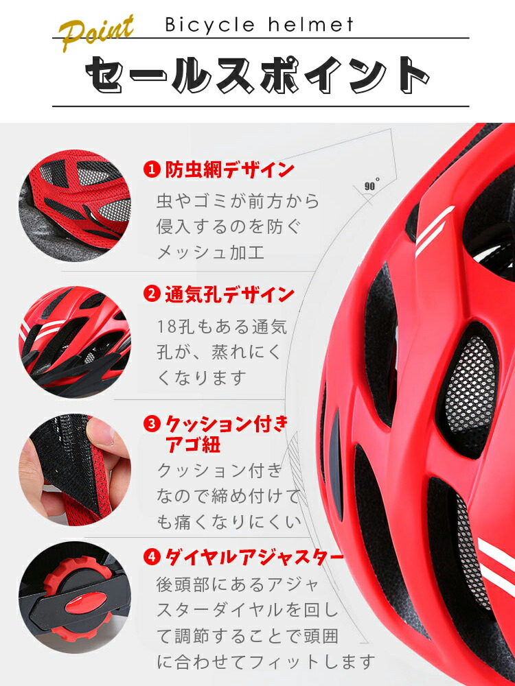 ヘルメット 自転車ヘルメット 自転車用ヘルメット サイクルヘルメット サイクリングヘルメット 防災ヘルメット 帽子 保護帽 頭部保護帽 セーフティーグッズ 自転車用品 自転車 自転車用 じてんしゃ サイクル スポーツ ロードバイク クロスバイク サイクリング マウンテンバイク スケボー スノーボード ハイキング キャンプ スキー適用 ローラースケート ローラーブレード スケートボード キックボード ダウンヒル 自転車通勤 通勤通学 通学 通勤 災害 防災 防災グッズ 避難 避難対策 非常用 登山 街乗り 乗馬 BMX MTB キッズヘルメット 子供ヘルメット スノボー スキー 一輪車 キックバイク エスボード ストライダー インラインスケート シンプル 無地 かわいい 可愛い かっこいい 格好良い 義務化 軽い 軽量 超軽量 高機能 多機能 流線型 一体成型 通気性 18通気穴 18孔 衝撃吸収 丈夫 サイズ調整可能 ダイヤル調整 ダイヤル式サイズ調整 ワンタッチダイヤル付 安全認証 安全性 安全安心 安心 安全 赤 黒 白