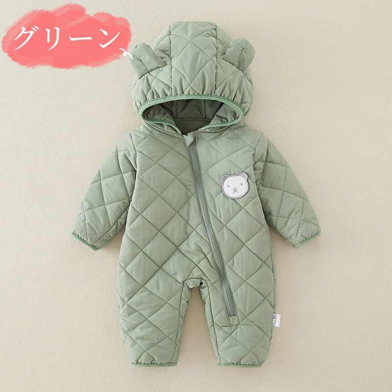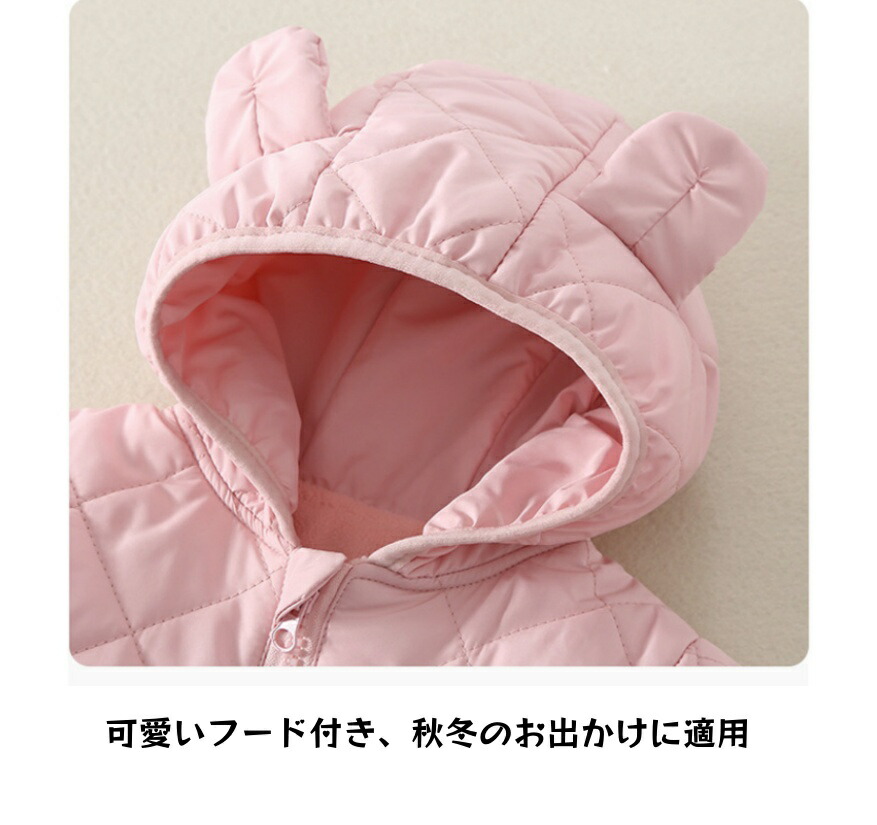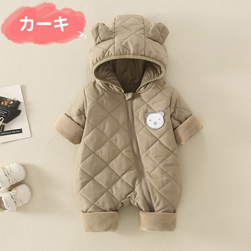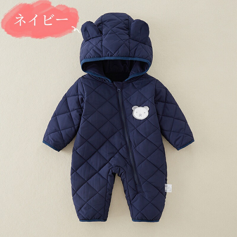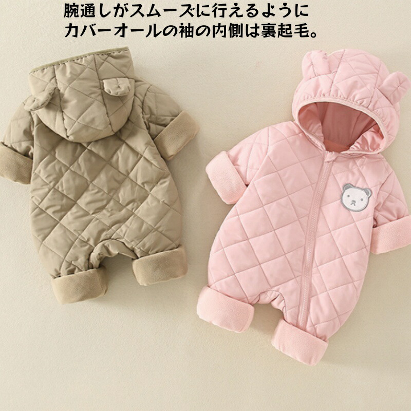 寒い日の「これ着せておけば安心!」を1枚で。ふわっと暖かい裏起毛に、上品なキルティング外側でおしゃれ見えも叶うベビー用ジャンプスーツです。フードのくま耳がたまらなく可愛くて、抱っこもお出かけも写真撮影も、つい着せたくなる冬の定番アウターに♪