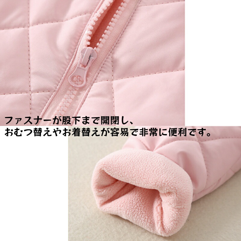 赤ちゃんの体をすっぽり包み込むオールインワンタイプで、防寒性と着やすさを兼ね備えています。