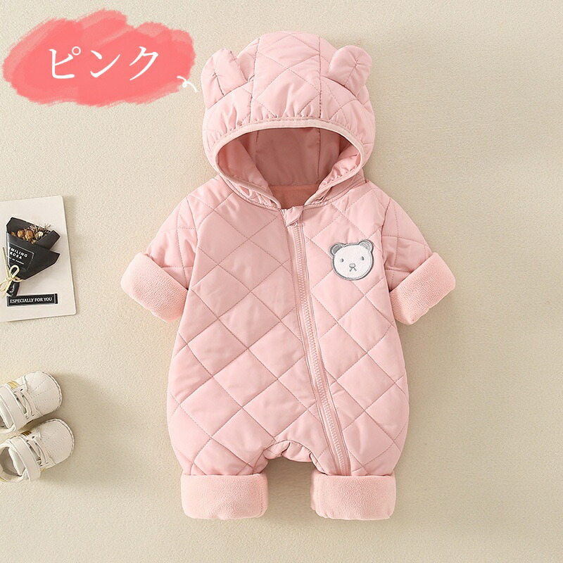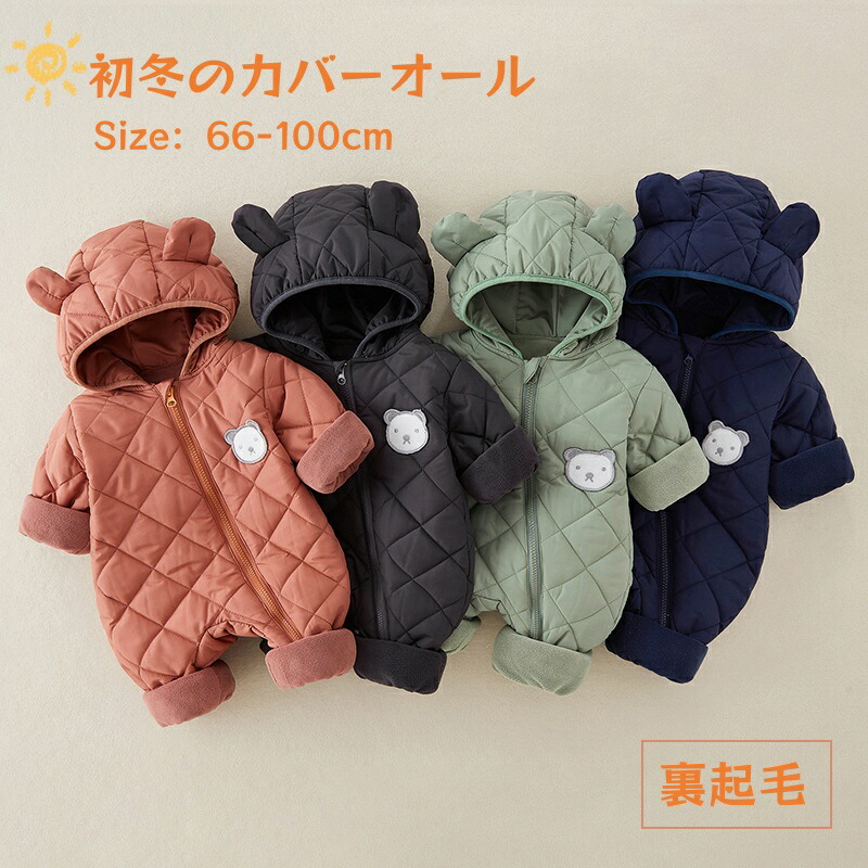 ベビー ジャンプスーツ 裏起毛 66 73cm 80 90 100cm 新生児 女の子 男の子 くま耳 冬 暖かい 外出 カバーオール 赤ちゃん 防寒 アウター おくるみ くま ロンパース もこもこ