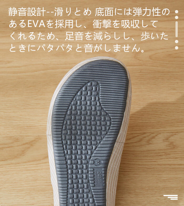 弾力性のあるEVA底が衝撃をしっかり吸収し、歩くときのパタパタ音を抑えます。