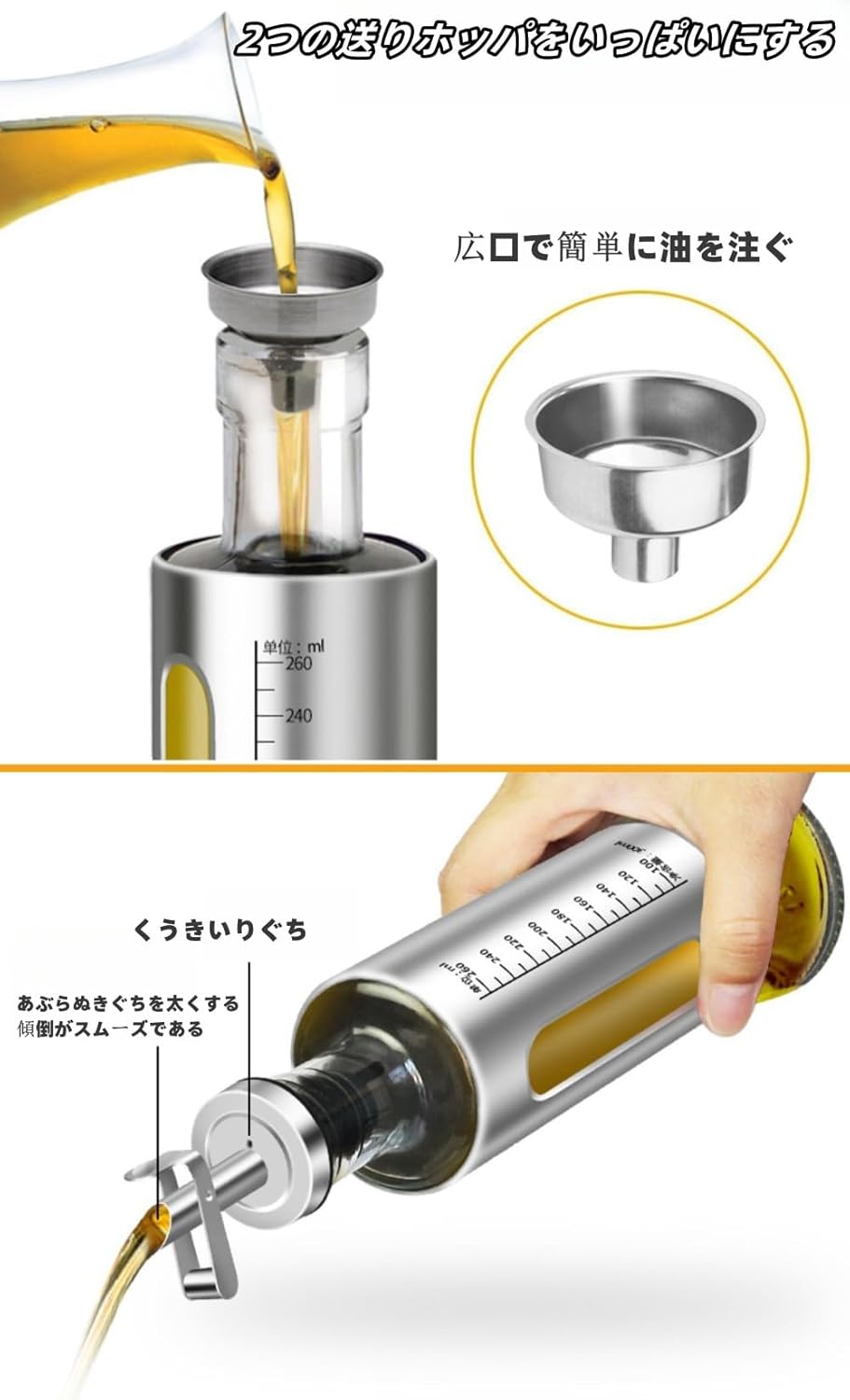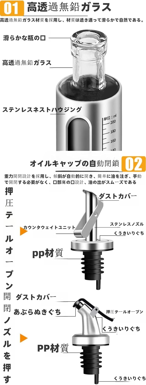 【食品グレードのオイルボトル】キャップ(外部)容器蓋:304ステンレス鋼,キャップ(内部)容器蓋:PP樹脂。 調味料ボトルのガラス材料耐熱ガラスはホウケイ酸という化学名で軽くで非常に優れた耐熱衝撃性を備えて、うっかり火のそばに置いても安心です。ご安心にお使えいただけます。