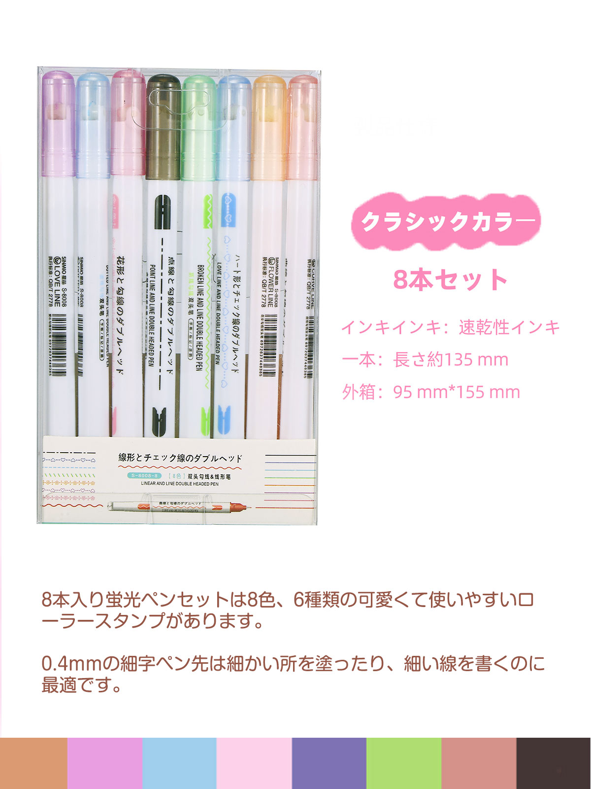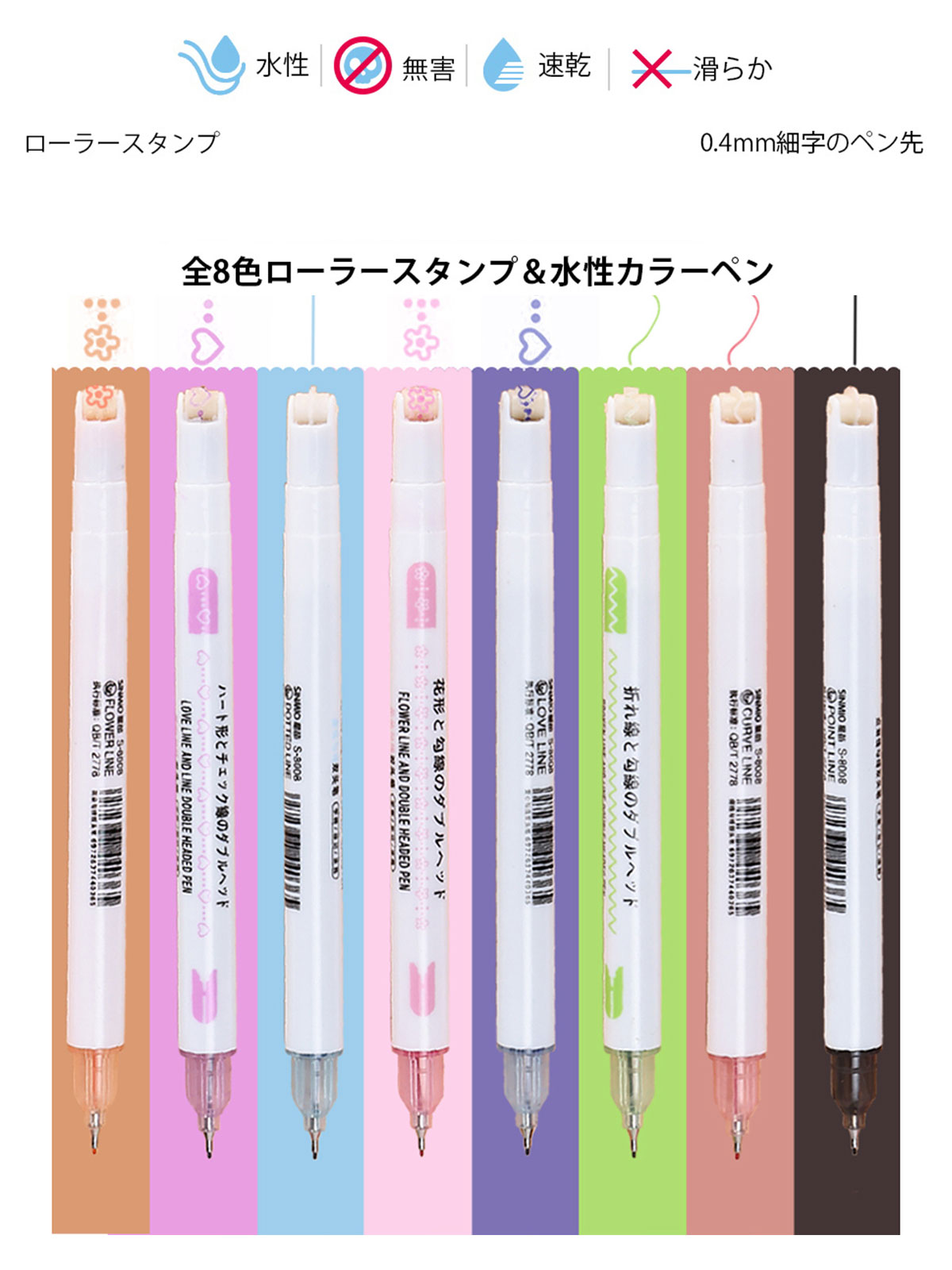 8本入り蛍光ペンセットは全8色、5種類の可愛くて使いやすいローラースタンプがあります。このペンでアンダーラインを引いたりするのはもちろん、メモしたり、日記、手帳、イラストを描いたり、模様をつけたりするのを気軽に楽しむことができます。この8色ペンセットを1つ用意すれば、様々な用途にお使いいただけます。当店にもデザイン同じで、他のカラーもありますので、お好みでお選びいただけます。