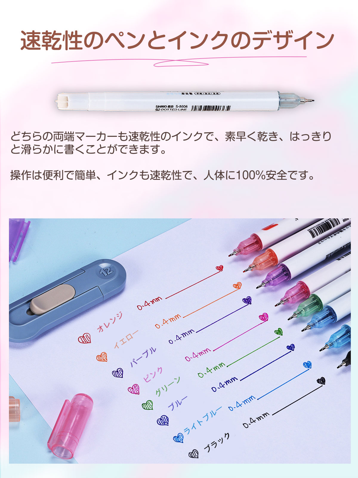 当社のカーブマーカーペンセットはすべて速乾性インクを搭載し、素早く乾き、手を汚さずに滑らかに書くことができます。100%安全設計で、身体に悪影響を及ぼすことはありません。子供も安心してお使いいただけます。