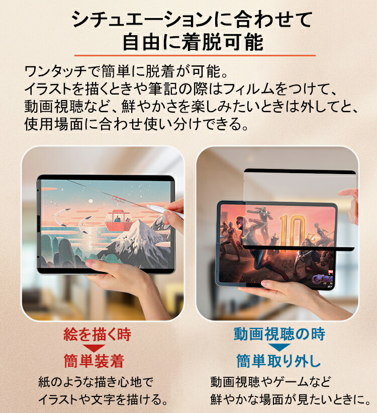 イラストを描くときや筆記の際はフィルムをつけて、動画視聴など、鮮やかさを楽しみたいときは外してと、