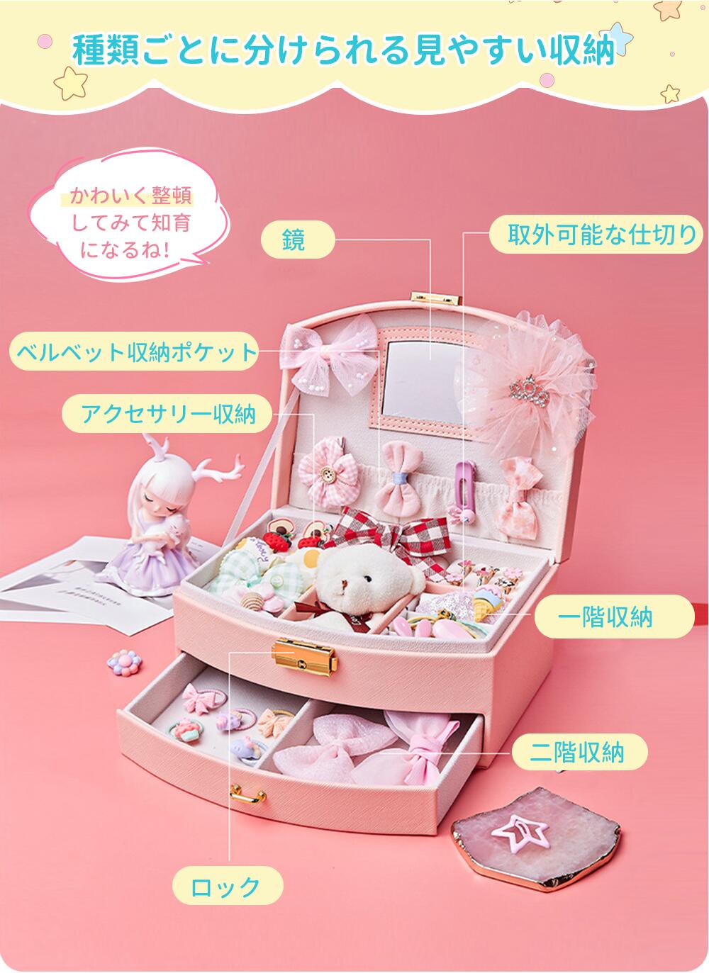 大容量で多機能、ママのコスメ入れとしても使えます。大人にも子供にも大人気!記念日も、普段の日もお子様といつまでも一緒に楽しんでいただける宝石箱です。