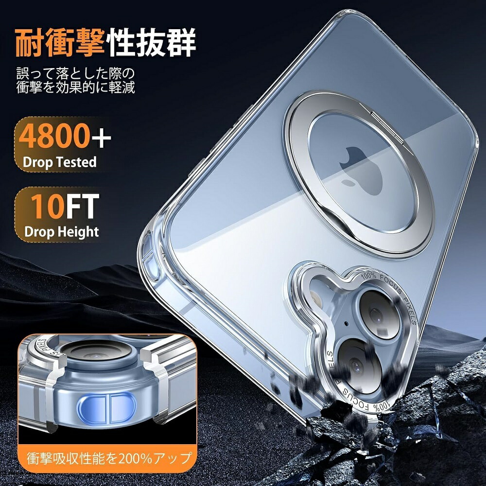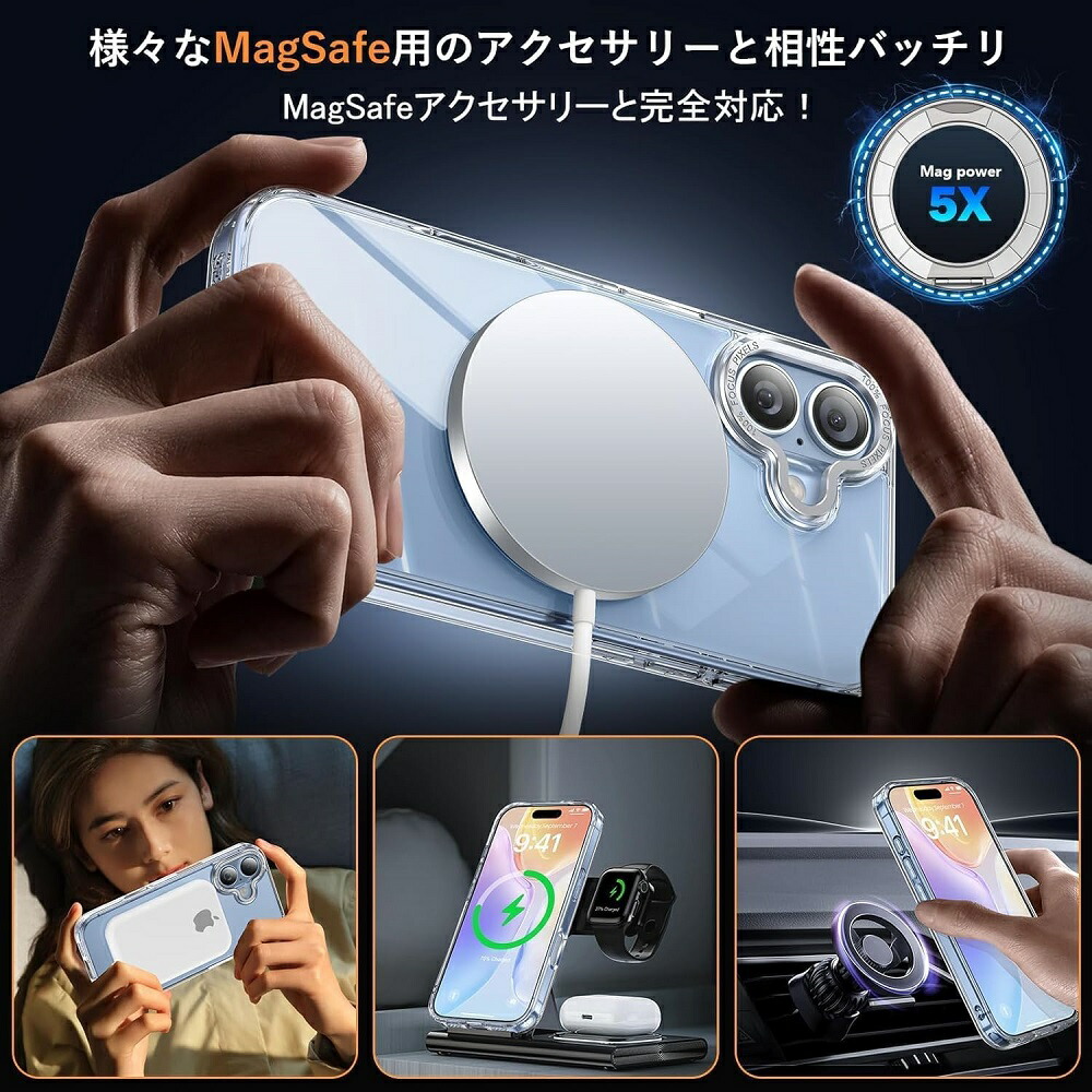 ケースをつけたままマグセーフ機能を快適に使用できます。背面に薄くて強いマグネット内蔵しています、ワイヤレス充電や車載ホルダーやアクセサリとのあらゆる充電に安定で接着ができ、差し込みのいらないより簡単により素早く充電できます。