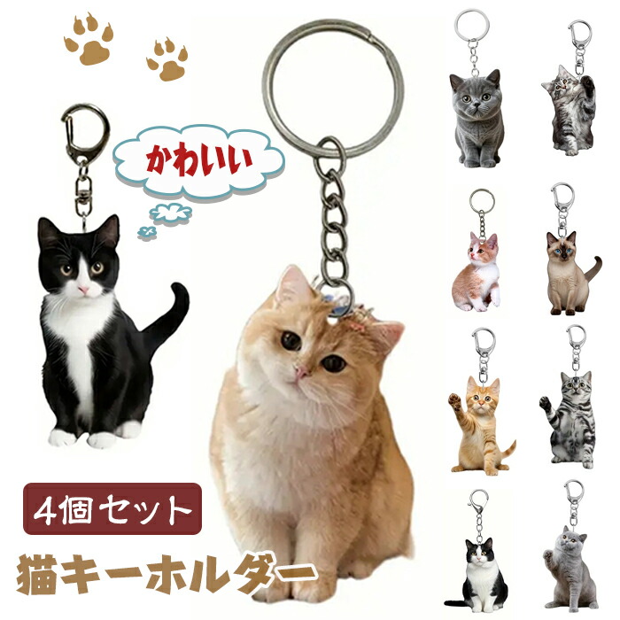4個セット 猫キーホルダー 猫 キーリング バッグ チャーム キーホルダーセット ポータブル キー アクセサリー アクリル テクスチャー 動物愛好家向け プレゼント 日常雑貨 かわ 2D