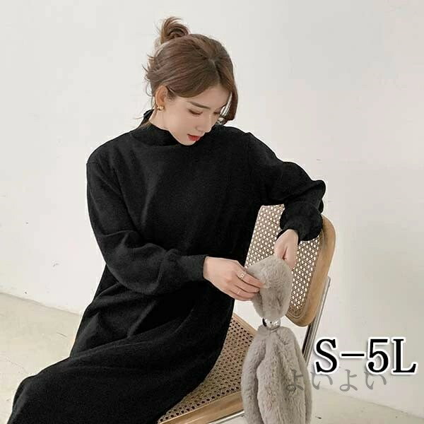 ニットワンピース レディース ブラック 黒 春 ニットワンピ オフィスレディー ハイネック あったか 大きいサイズ 膝丈 長袖 韓国