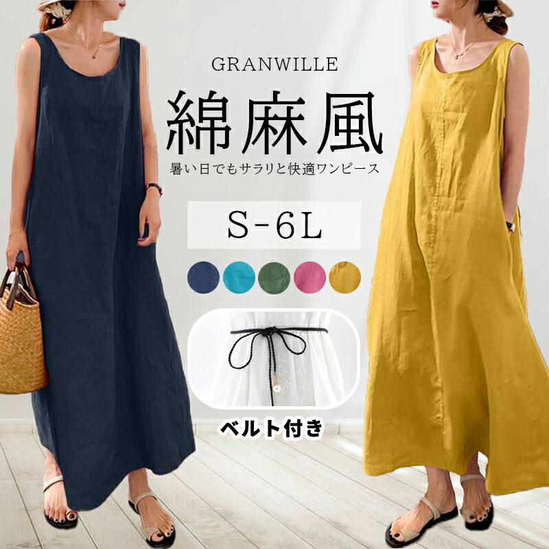 ワンピース レディース 夏 きれいめ 綿麻風 大きいサイズ ノースリーブ ワンピ 春 Aライン 低身長 マキシ マキシ丈 ロング丈 着痩せ 体型カバー 無地 大人 カジュアル オシャレ 涼しい 通勤