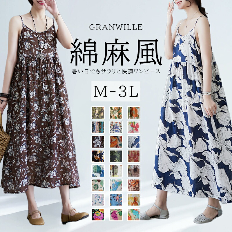 キャミワンピース 綿麻風 ワンピース レディース 夏 きれいめ 花柄 ノースリーブ 春 着痩せ 体型カバー ロングワンピース マキシ丈 ロング丈 涼しい 低身長 オシャレ かわいい キャミ カジュアル