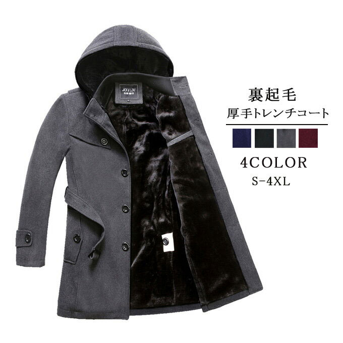 トレンチコート メンズ ウール コート ビジネスコート フード付き 裏起毛 裏ボア防寒 暖かい あったか ステンカラーコート ミドル丈 チェスターコート 厚手 通勤 冬物 アウター