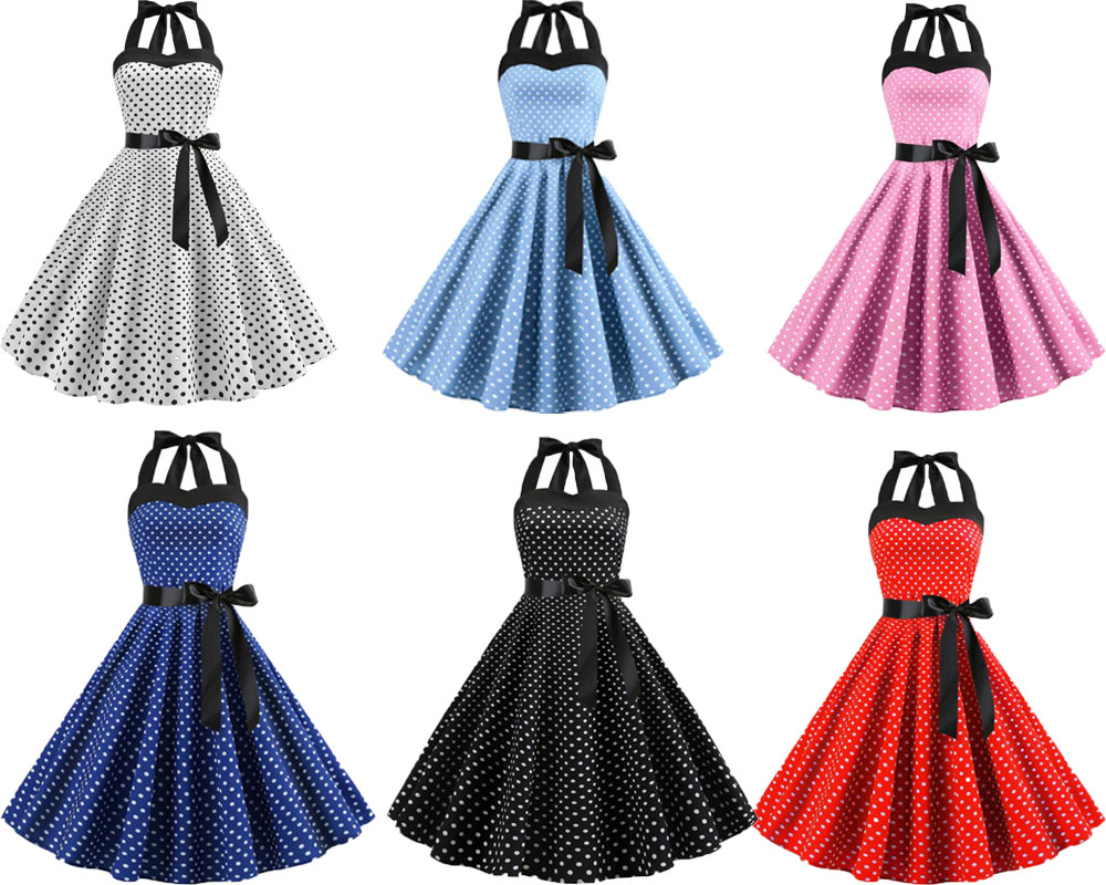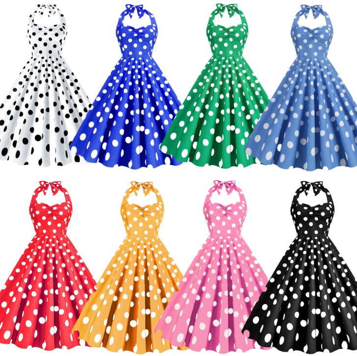 ドット柄ドレス 膝丈 レトロワンピース 女性 ダンス衣装 水玉柄 大きい裾ワンピース 細身 ノースリーブ フレアドレス パーティードレス 演出服 ステージ衣装 団服 8色 イベント