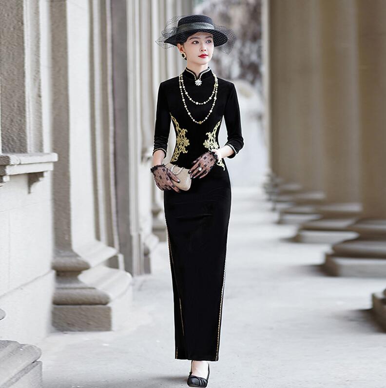 細身 チャイナドレス ロング丈 七分袖 中華風 パーティードレス マキシ丈 ベロア チャイナ服 刺繍 中華風 ドレス スリット 発表会 謝恩会 花嫁 お呼ばれ 中華服 ファッションショー 礼服