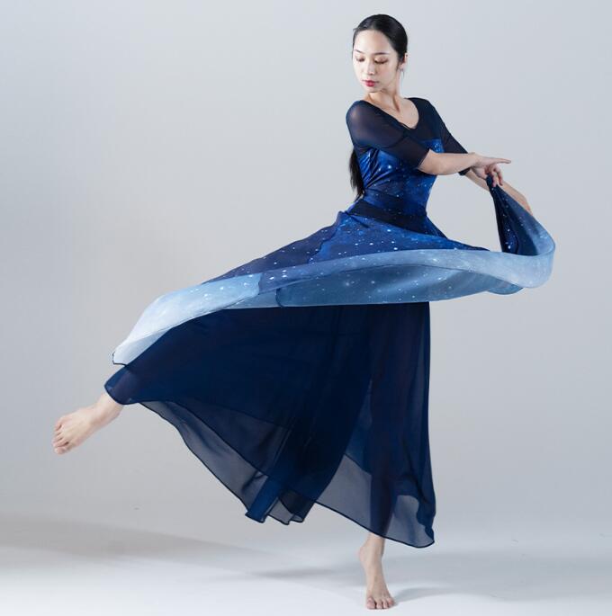 レディース ダンス衣装 星空 グラデーション 舞台演出服 古典ダンス 五分袖 レオタード シフォン 大きい裾 巻きスカート 星空元素 モダンダンス 半袖シャツ ラップスカート