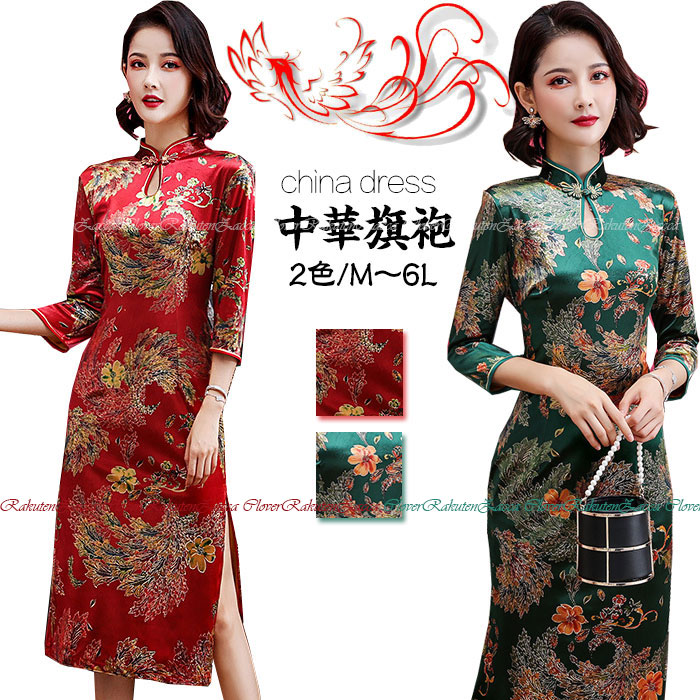 中華服 チャイナドレス グリーン 緑 レッド 赤 バンクファスナー ~6 大きいサイズ