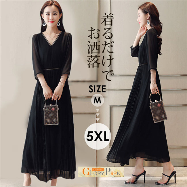 パーティードレス 大きいサイズ 結婚式 ワンピース フォーマル 大人 ロングドレス 袖あり Vネック レディース 春夏新作 7分袖 エレガント ピアノ発表会 演奏会 黒 コ スリムに見える