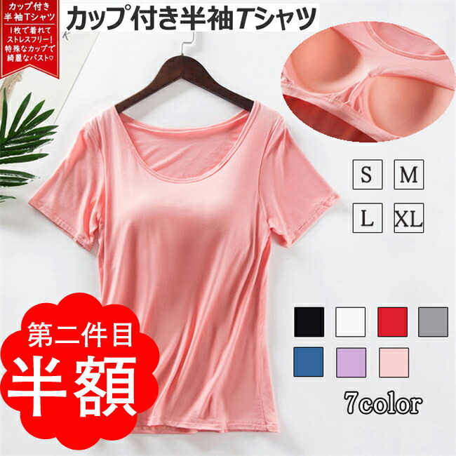 第2件目半額799円だけ カップ付き ブラトップインナー レディース 半袖 カジュアル Tシャツブラ ルームウェア ブラ カットソー 定番 ベーシック 夏 無地 速乾 スポーツ Tシャツ 丸首