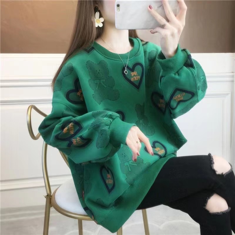 トレーナー レディース 春秋 ゆったり トップス おしゃれ カジュアル 長袖 可愛い 丸首 クマ柄 グリーン ホワイト M XL 2XL SLUA390 L