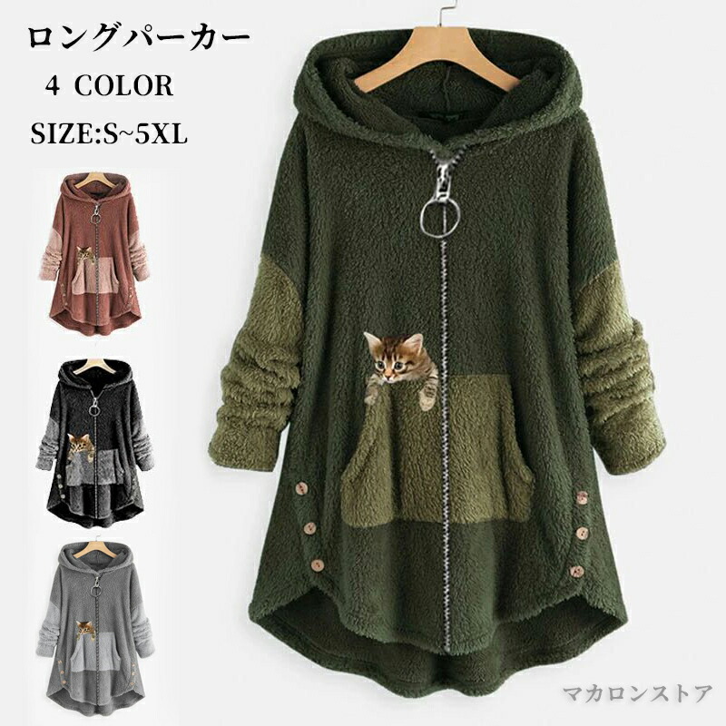 パーカー レディース プルオーバー ジップアップ ロングパーカー フード付き 長袖 ビッグシルエット 猫柄 猫耳 ゆったり もこもこ 人気 裏起毛 コート 体型カバー 秋冬 おしゃれ ジッ