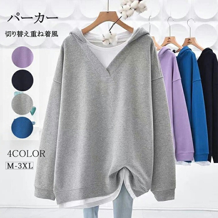 パーカー レディース プルオーバー ボリュームスウェット スウェットパーカー フード付き Vネック 重ね着風 長袖 カジュアル 大人 秋冬 冬 秋 春 かわいい 体型カバー 通勤 通学 無地 女性用