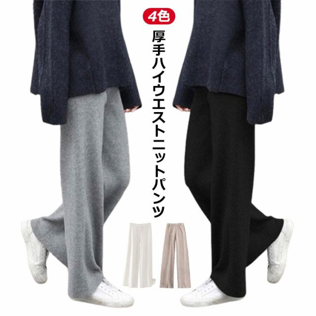 厚手 ハイウエスト ニットパンツ 秋冬 リブニットパンツ 暖かい ウエストゴム ワイドパンツ