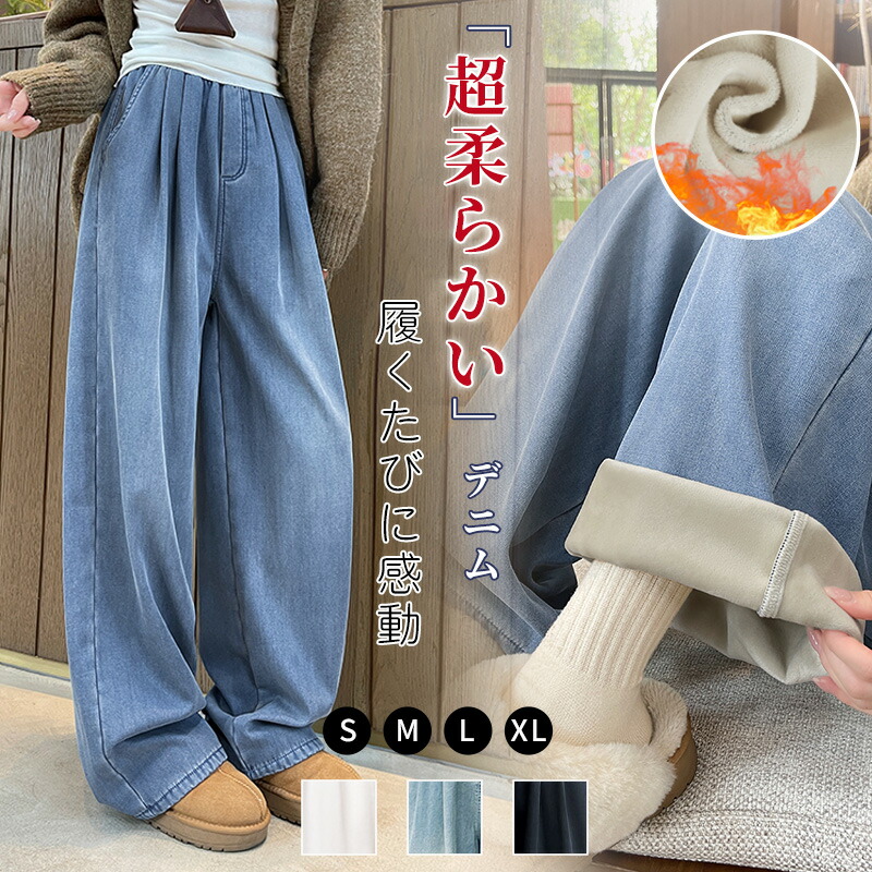 ワイドパンツ デニム 裏起毛テンセル 体型カバー ゴム レディースパンツ リヨセル テンセル 疲れない カジュアル ゆったり ブラック ブルー ホワイト S M L 春夏秋服装 普通丈 短め丈 XL