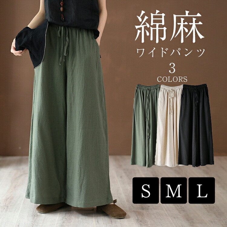リネン40% 綿麻 ワイド パンツ レディース きれいめ ワイドパンツ ガウチョパンツ イージーパンツ 女性 麻 コットンリネン スカーチョ ウェストゴム ウェスト紐 体型カバー スカンツ
