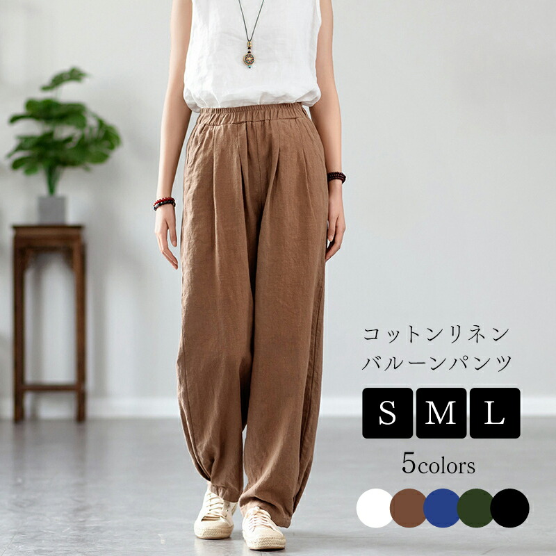 リネン80% コットンリネン バルーンパンツ サルエルパンツ 綿麻 黒 白 茶色 紺色 ワイドパンツ リネン レディース メンズ ズボン 総ゴム ポケット 綿麻キャンバス パンツコーデ き 体型カバー