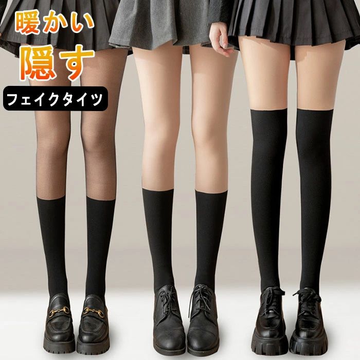 ストレッチ 防寒 美脚 着圧タイツ 暖かい あったか 裏起毛 透け感 ニーハイ レディース 冬 2枚 フェイクタイツ ソックス風 肌色