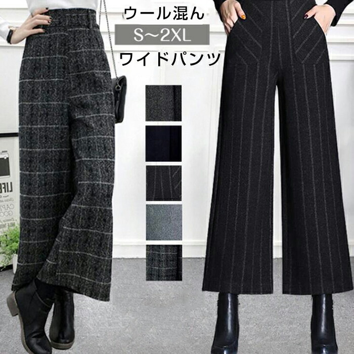 ウール混スカンツ ハイウエスト ワイドパンツ レディース 秋冬 ズボン ワイド スカーチョ ガウチョ パンツ 女の子 通勤 ボトムズ チェック柄 バックゴム ブラック グレー 無地