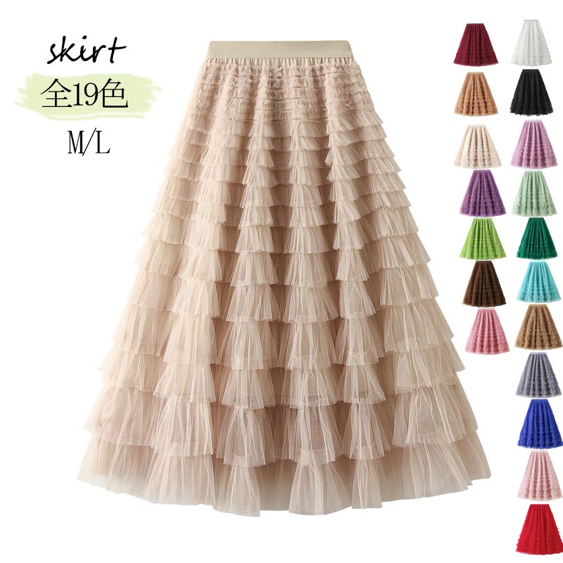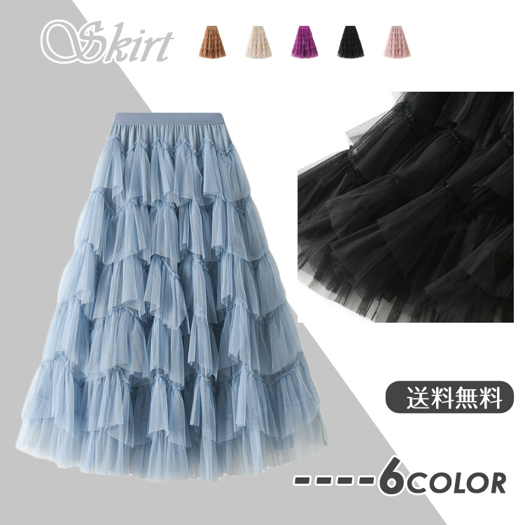 スカート ティアードスカート ロングスカート チュールスカート レース ベージュ ブラック ピンク ブルー パープル マキシスカート ウエストゴム ボリューム トレンド 動きやすい フリル