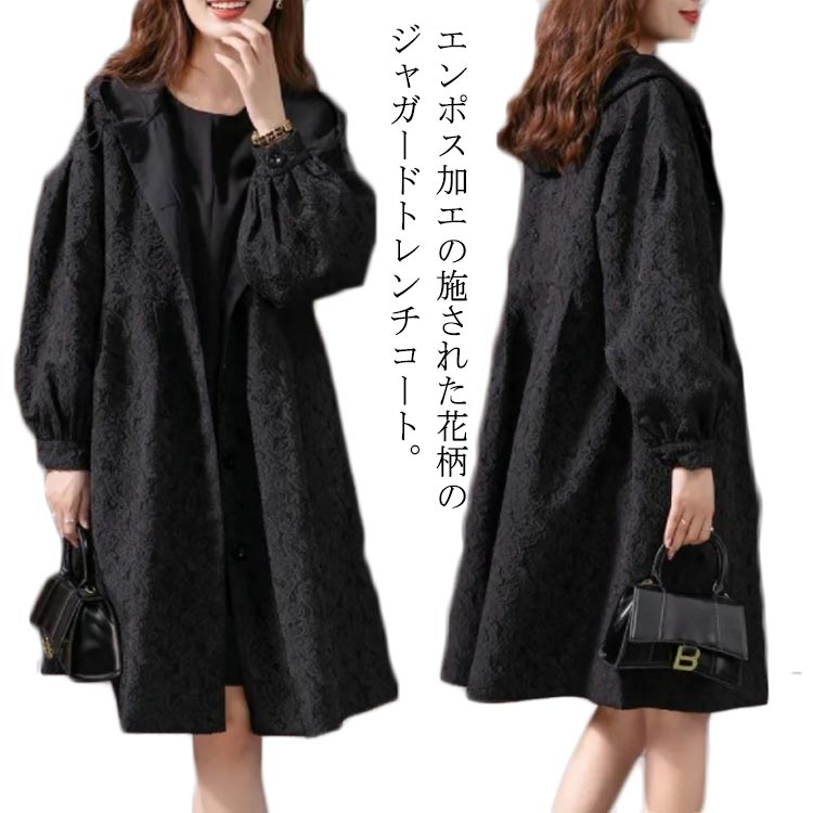 ミディ 羽織 アウター コート 花柄 長袖 Aライン エンボス加工 ロングコート スプリングコート レディース ジャガード