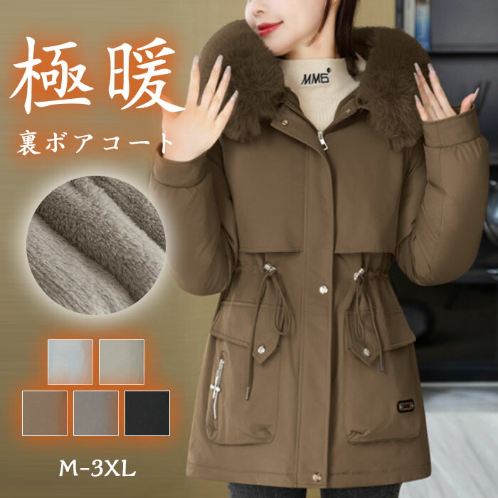 裏ボアコート モッズコート ふわふわ もこもこ 長袖 中綿コート きれいめ お洒落 防寒 レディース 綿入れ 厚手 羽織り フード付き ファー付き ミディアム丈 温かい 冬 大きいサイズ
